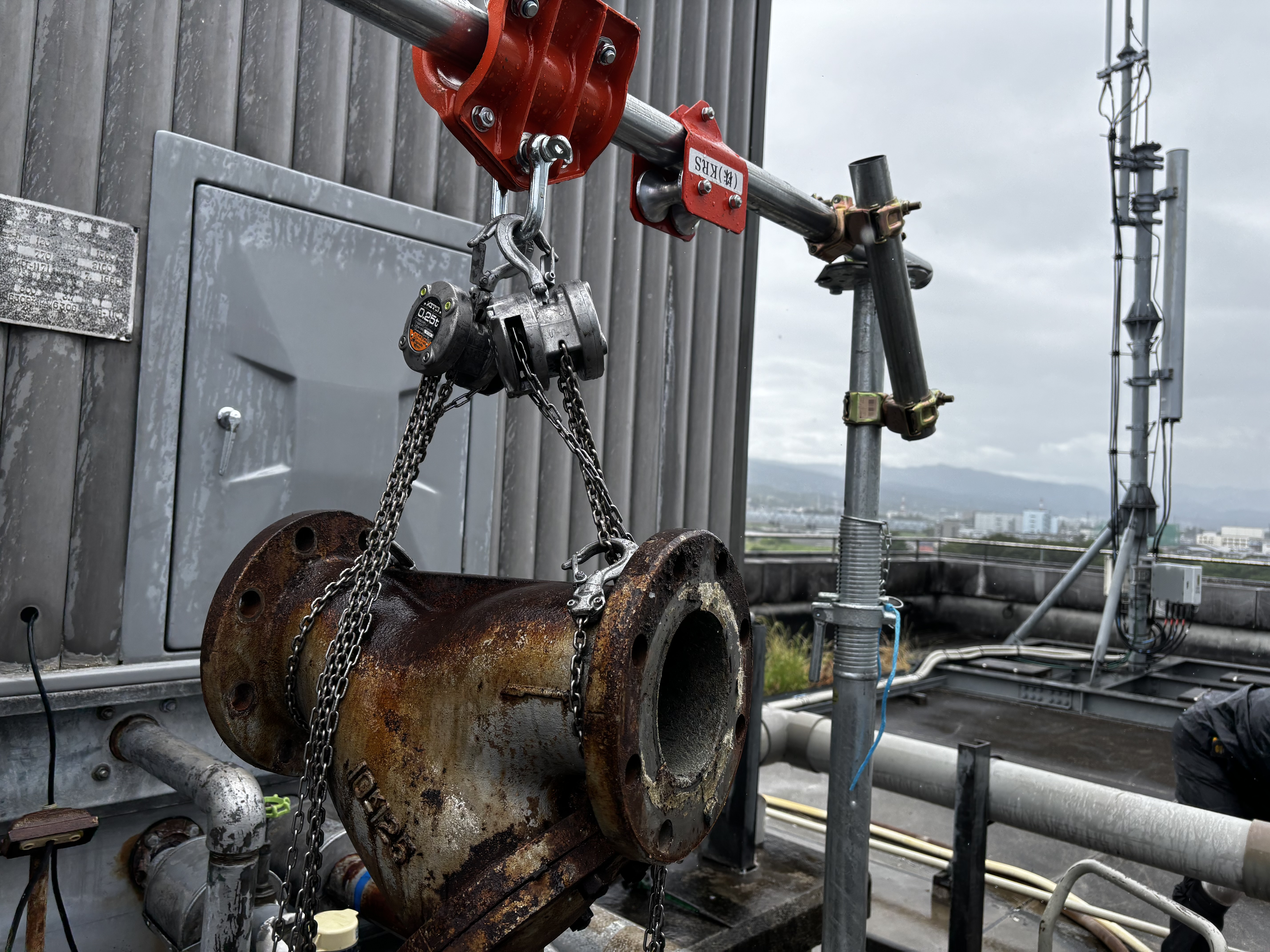 125A(フランジ外径150mm)のY型ストレーナは重量が約70kgある為、単管パイプで門型を組んでの交換となりました。(↓写真)